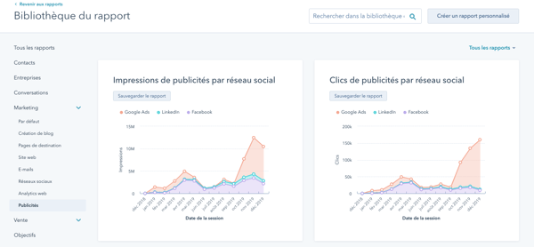 Vous pouvez trouver ces rapports en cliquant sur le bouton de rapport publicitaire sur un tableau de bord pour entrer dans la bibliothèque de rapports, puis en cliquant sur marketing et ensuite sur la navigation latérale et enfin en cliquant sur la catégorie d'annonces.